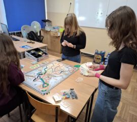 Czwartkowe spotkanie rozpoczęliśmy poszukiwaniami i ćwiczeniem naszej spostrzegawczości, z sukcesem rozgrywając partię w Spy Guy. Przy drugim stole w tym czasie uczniowie zapoznali się z kolejną planszówką i ucząc się gry w Baronię poszerzali swoje terytoria. Oprócz tego zagraliśmy w Catan i nie mogło zabraknąć naszego dotychczasowego ulubieńca, czyli gry Wsiąść do pociągu - Europa:)